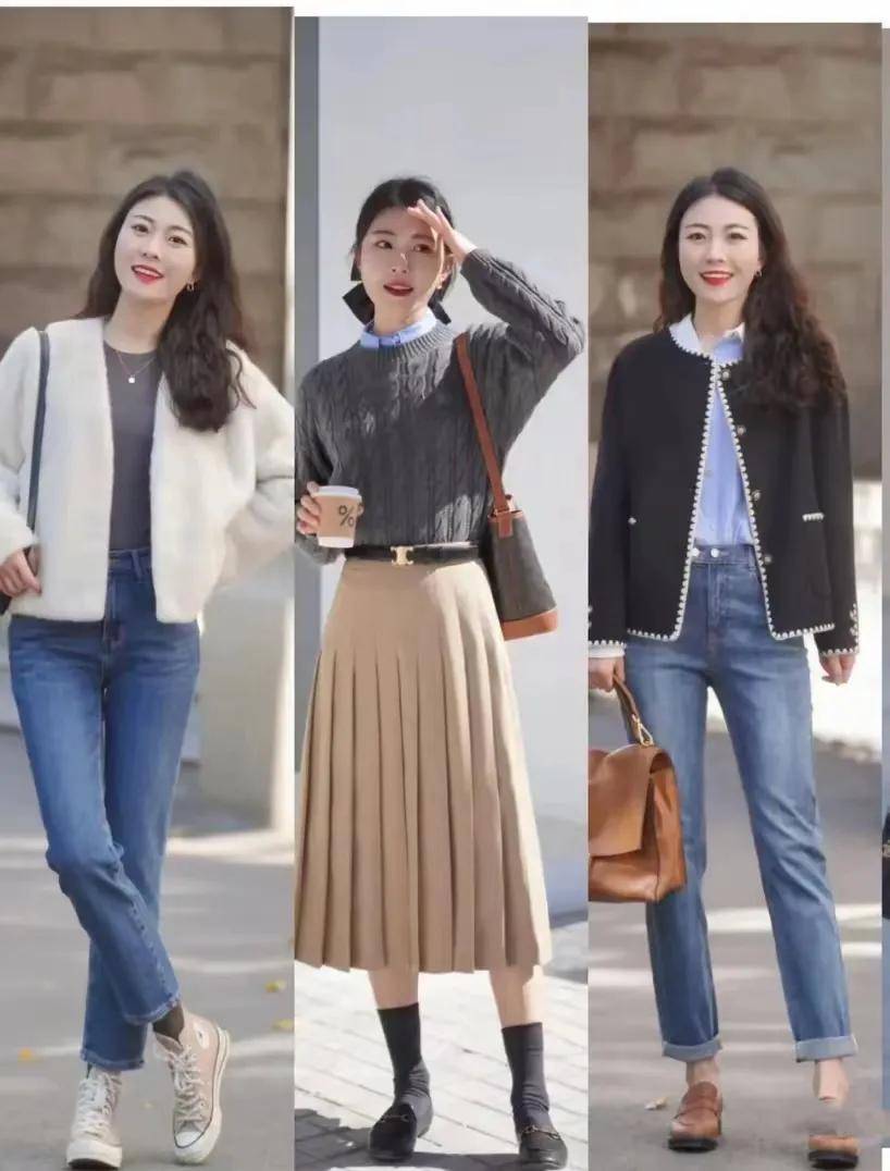 例如,下面这两套穿衣打扮就很不错,可以直接选择一件黑色的毛衣搭配上牛仔烟管裤,脚上踩的一双前后的单鞋就够了。