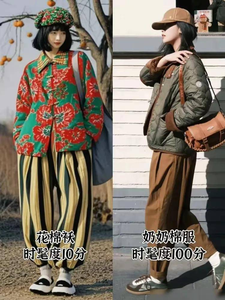 更不要说选择花哨的羽绒服了,下面这样的花棉袄搭配上条纹长裤,头戴花色的贝雷帽,连00后的美少女穿在身上都没法驾驭。