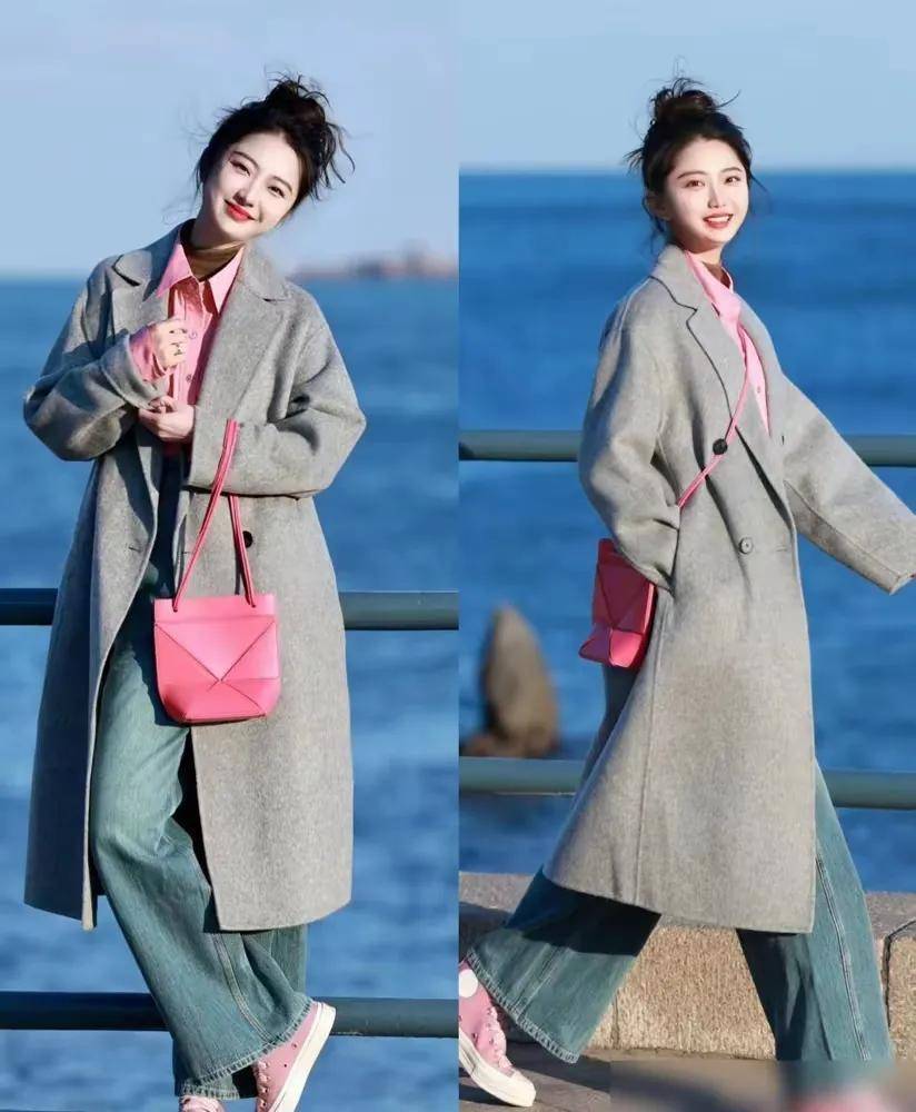 ②,灰色大衣搭配牛仔阔腿裤