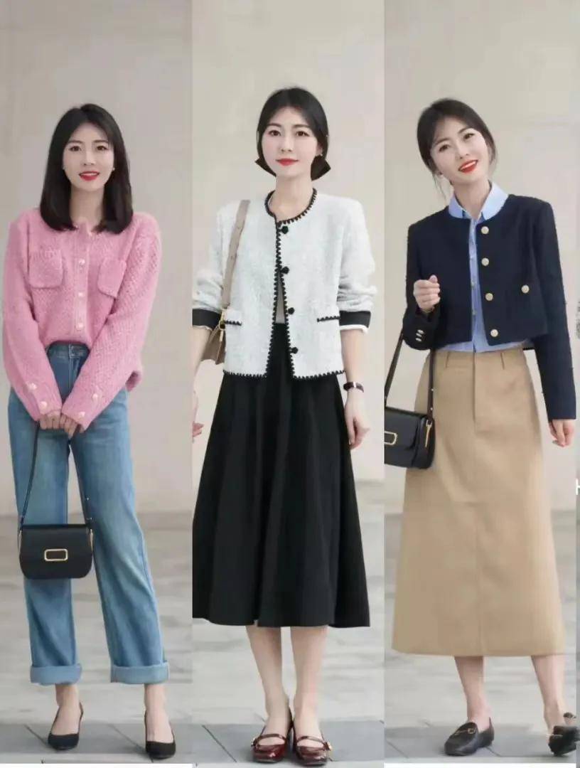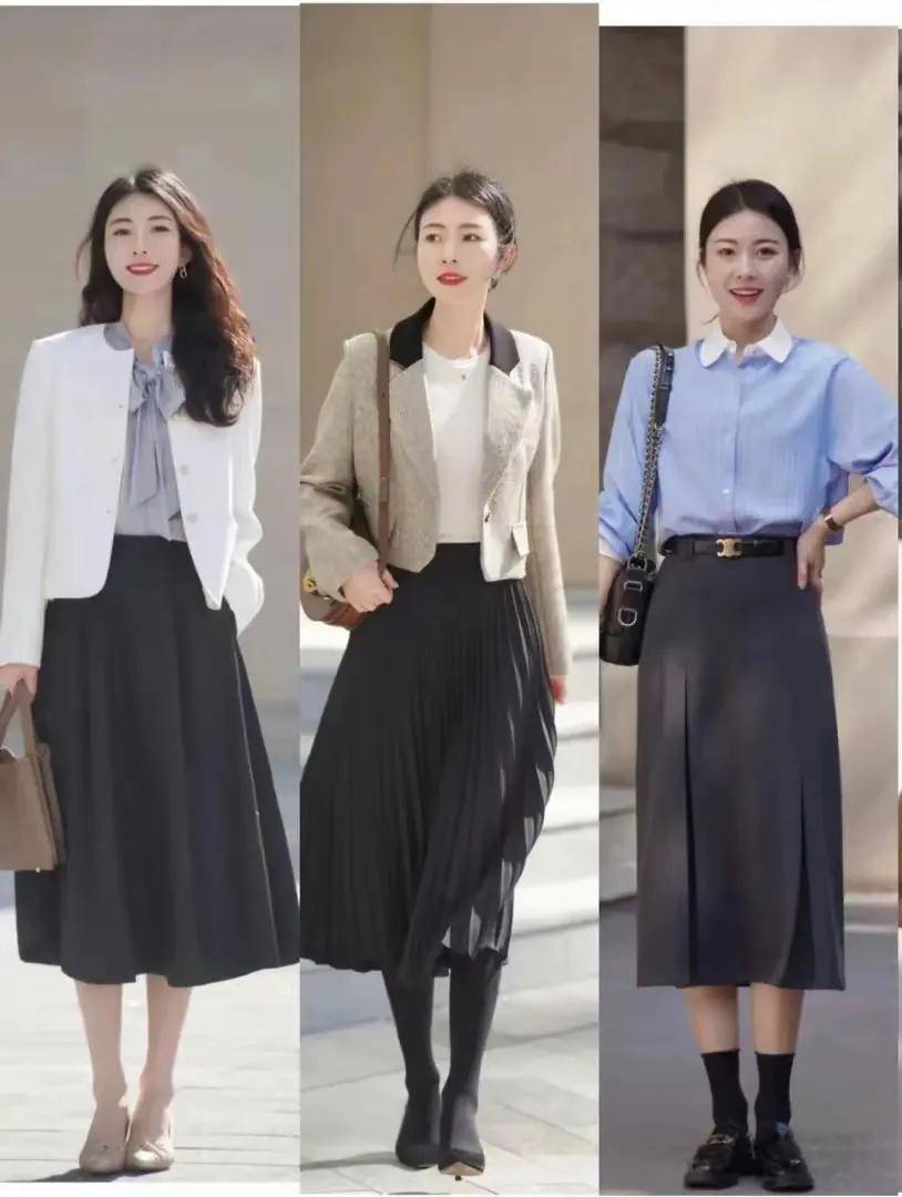 下面前面的两套穿衣造型都采用了上短下长的搭配方法,短款的西装外套或者是小香风外套内搭一件毛衣打底衫衬衫,下半身选择黑色的百褶半身裙或者是伞状半身裙,脚踩一双浅口单鞋,这样的穿衣造型简约大方,优雅得体,可以说是谁穿谁美,照着穿轻松,降低出错率。