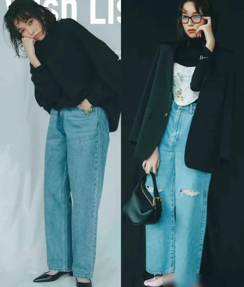 咱们看下面这两条阔腿裤就有点过长了,特别是左边的这条牛仔阔腿裤正常,普通大众女性穿了,可能你出去逛街,一会儿回来,你的裤脚已经沾满了灰尘,所以没必要选择这么长的裤型。