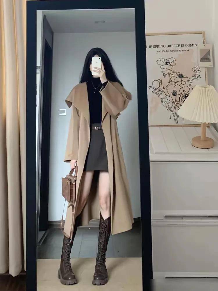 除非你确实拥有修长鼻子的美腿,而且所在的城市是属于南方天气比较暖和,这个时候你可以像下面这位博主一样,用大地色的大衣外套内搭黑色的毛衣,扎进咖色的短裙,脚踩一双中筒靴,这样的穿衣造型更能延伸腿部线条,使得穿搭者的身材变成三七分。
